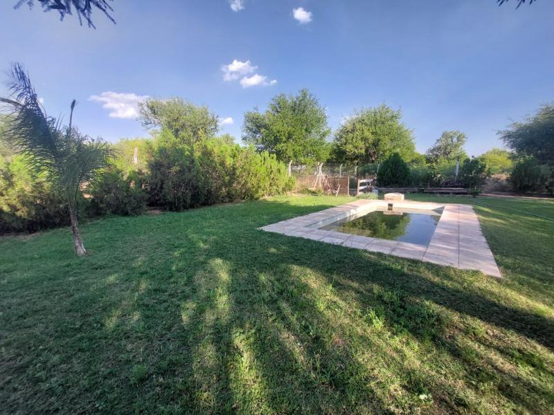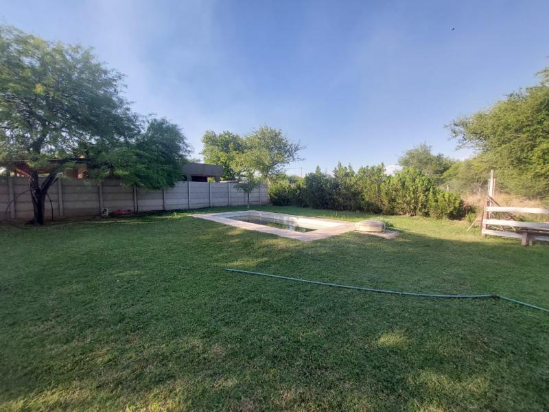 Distribución: Inmueble construido en planta baja, compuesto por: *Cocina - Living - Comedor integrado (Cuenta con mesada de granito con bacha doble de acero inoxidable y grifería, mueble bajo mesada de melamina); *2 Dormitorios (Uno con baño en suite); *1 Baño completo con antebaño; *Lavadero; *Cuarto de depósito; *Patio trasero parquizado con pileta (Medidas: 3x6 mts.), variedad de plantas; *Asador. Superficie cubierta: 150 metros cuadrados construidos cubiertos aproximadamente. Superficie terreno: 20 metros de frente por igual contrafrente por 40 metros de fondo (800 metros cuadrados aproximadamente). Servicios: Agua y energía eléctrica. El barrio posee: alumbrado público, caminos de ripio. Antigüedad: 5 años aproximadamente. Observaciones: El inmueble tiene buena distribución de ambientes luminosos, ventilados y amplios. Posee sistema de riego con agua por perforación. Cerrado con postes de quebracho y alambrado perimetral de 1,5 metros de alto.