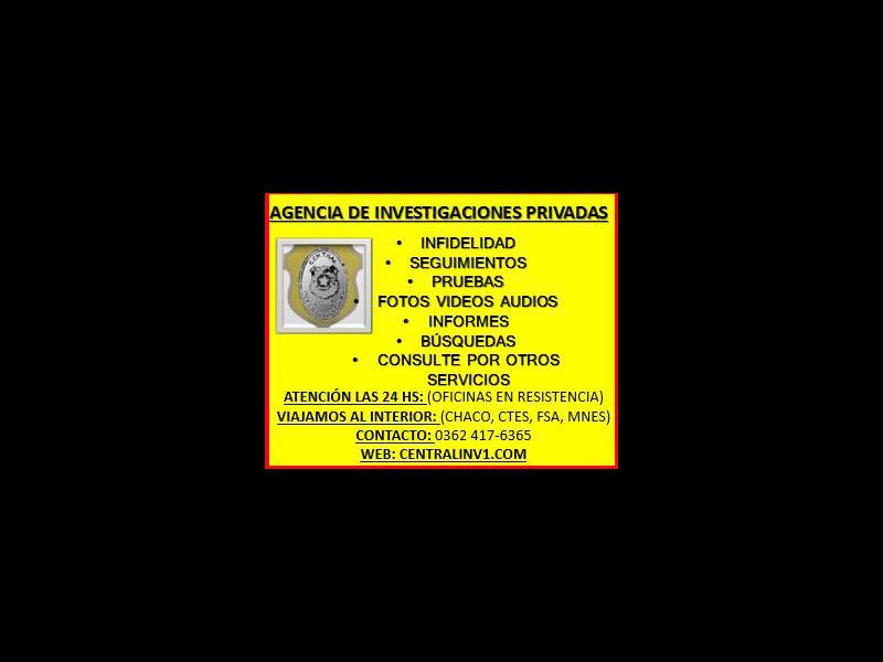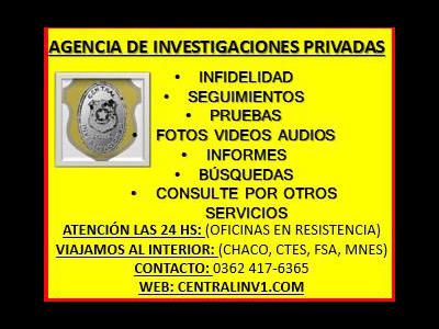 Infidelidad, Seguimientos, Obtenemos los Resultados, SMS, Detalles de Movimientos, Registros, Whatsapp, Informes, Números, Dominios, Antecedentes, Fotografías, Filmaciones, Audios, GPS, Triangulación y Ubicación, Deudas, Cobranzas, Cheques Rechazados o Falsos, Recupero de Vehículos, Camiones, Maquinarias y Equipos Agrícolas, Búsqueda de Personas. Consulté por Otros Servicios. Viajamos al Interior de Chaco, Ctes, Fsa, Mnes, Santa Fe, Rosario, Cba, entre Otros.