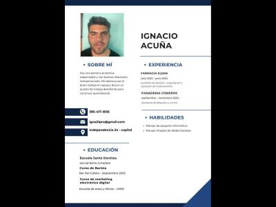 Escuela dorotea- instalador de camaras de seguridad , agosto 2024marketing electrónico digital año205(UNSE) oficio barista nombre del profesor: José Alberto Pereyra bar del cafeto septiembre del 2025, experiencia en atención de farmacia hasta el año pasado secundario completo 2023